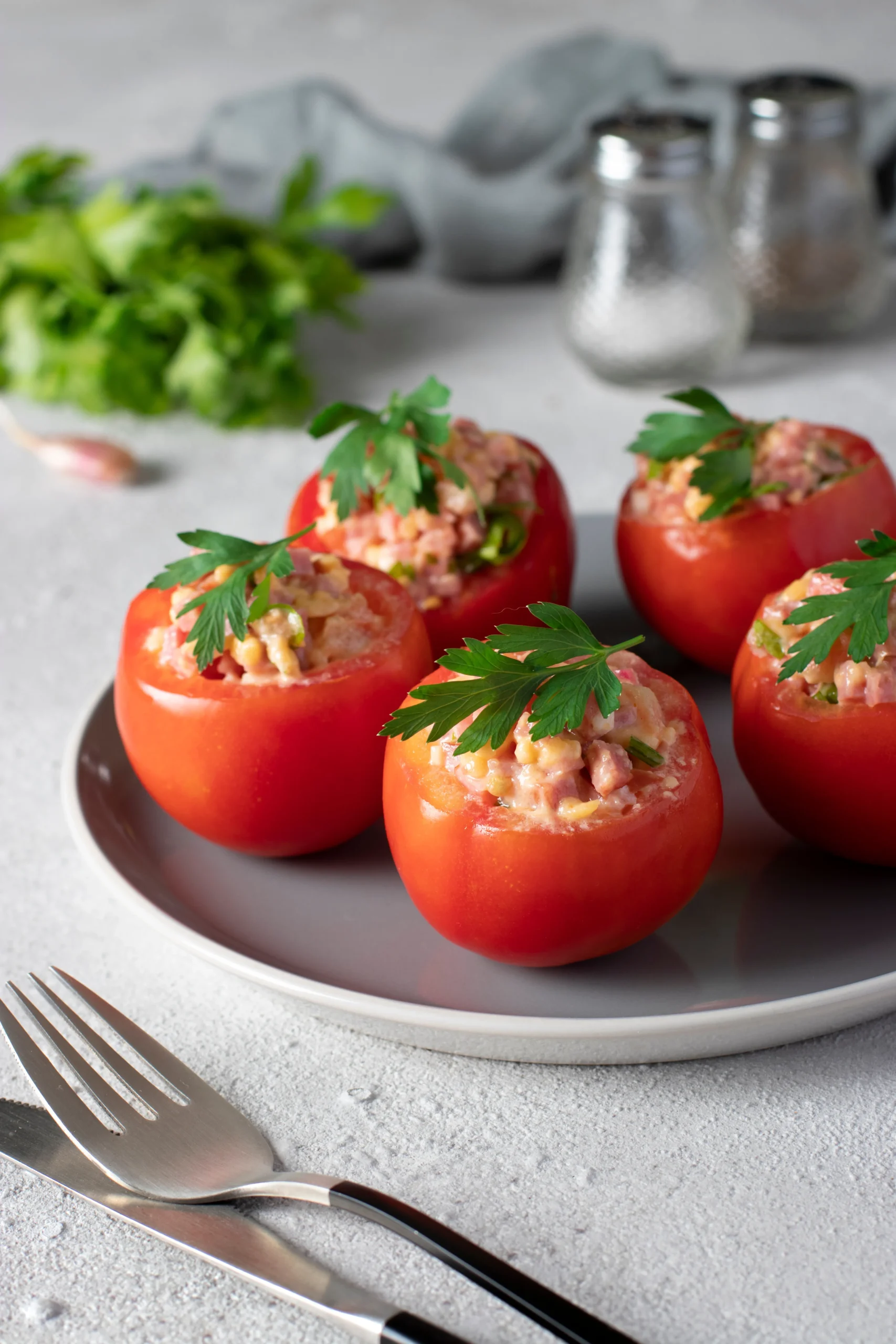 - In a small bowl, combine remaining ingredients. Spoon into tomatoes. Refrigerate for several hours.
